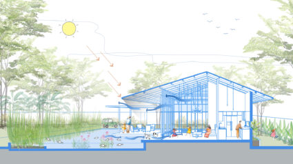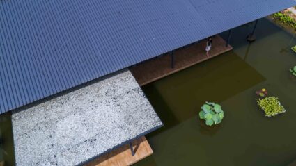 The roof is also designed to extend toward the pond to reduce the impact of direct sunlight on the glass doors..