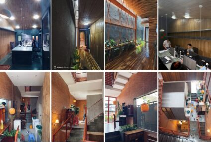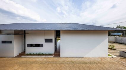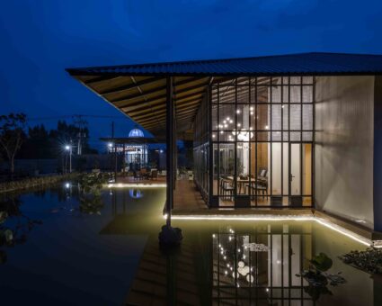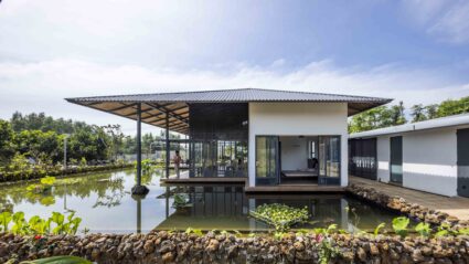 For the private functional blocks, we applied traditional construction methods with three simple painted brick units. These blocks are physically separated, with the gaps between them strategically designed to enhance ventilation and facilitate convection airflow from the pond into the house.”