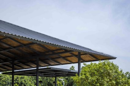 For the common spaces and the roofing system, we experimented with a prefabricated galvanized steel frame. This is covered with insulated PU roofing sheets on top, and finished with a natural wood ceiling underneath.