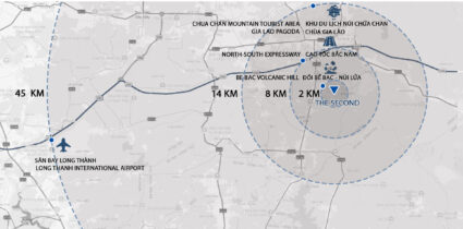 The project is located in Dong Nai — Southeast Vietnam — approximately 55 km from the under-construction LONG THANH INTERNATIONAL AIRPORT, 8 km from the NORTH-SOUTH EXPRESSWAY, and 20 km from the CHUA CHAN MOUNTAIN TOURIST AREA – GIA LAO PAGODA. Local young residents fondly refer to this area as “Lang Me City.”.